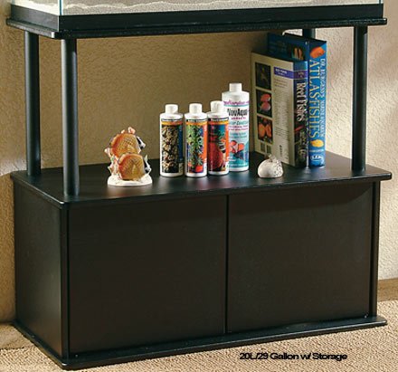 Affordable aquarium stands with the perfect combination of strength, clean lines, and convenience. Extremely durable, medium density fiberboard (MDF) construction includes a solid top for greater stability. Stand w/Shelf keeps all of your aquarium essentials within an arm's reach and Stand w/Storage has magnetic doors to keep supplies handy, but out of sight. Moisture-resistant, black powder-coated finish. Ready-to-assemble construction. (Aquariums sold separately.) Size Dimensions 10 Gallon 21-1/2" x 11-1/2" x 27-1/4" high 20H Gallon w/Shelf 25" x 14-1/2" x 27-7/8" high 20L/29 Gallon w/Shelf 31" x 13-1/2" x 27-7/8" high 20H Gallon w/Storage 25" x 14-1/2" x 27-7/8" high 20L/29 Gallon w/Storage 31" x 13-1/2" x 27-7/8" high 55 Gallon w/Storage 49-1/2" x 14-1/2" x 27-7/8" high Read more...